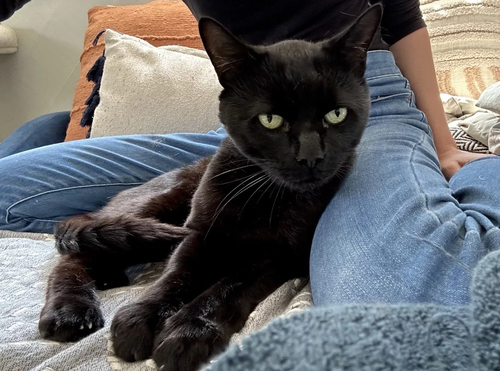 Quando o conheci, um lindo gatinho preto caminhou direto em minha direção e passou entre minhas pernas. Quando me deitei no chão, ele se enrolou em volta da minha cabeça e, eventualmente, na minha barriga, ronronando o tempo todo. Ficou claro que Olaf era um gato que desejava atenção e carinho.