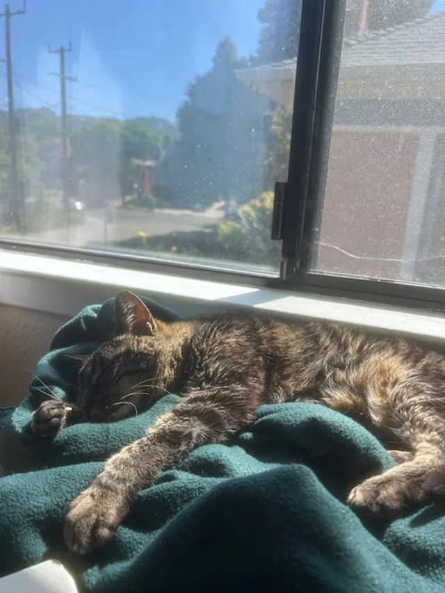Há alguns dias, procurei uma atualização. Megan compartilhou que a saúde de Jade está estável e agradeceu a Cat Town por ajudá-los a aprender como cuidar dela desde o início. Ela me disse que Jade tem sido o complemento perfeito para sua pequena família – e enviou fotos de seu primeiro dia de neve e de seu local favorito perto da lareira, exatamente como um gato idoso deveria: seguro, caloroso e profundamente amado.