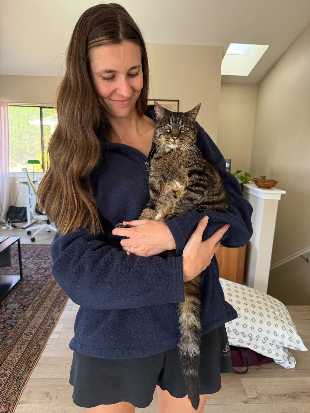 Como Coordenador de Cuidados com Gatos, trabalhei em estreita colaboração com Owen e Megan em todas as etapas – e eles nunca se intimidaram com as necessidades de Jade. Owen aprendeu a administrar fluidos subcutâneos e injeções para que Jade pudesse receber cuidados consistentes em casa. Eles comemoraram pequenas vitórias, como o ganho de peso medido em décimos de quilo, e se preocuparam juntos com os contratempos. Acima de tudo, eles adoraram Jade – suas vocalizações cada vez maiores quando ela começou a se sentir melhor, suas demandas mandonas por atenção, sua insistência em se envolver em tudo.