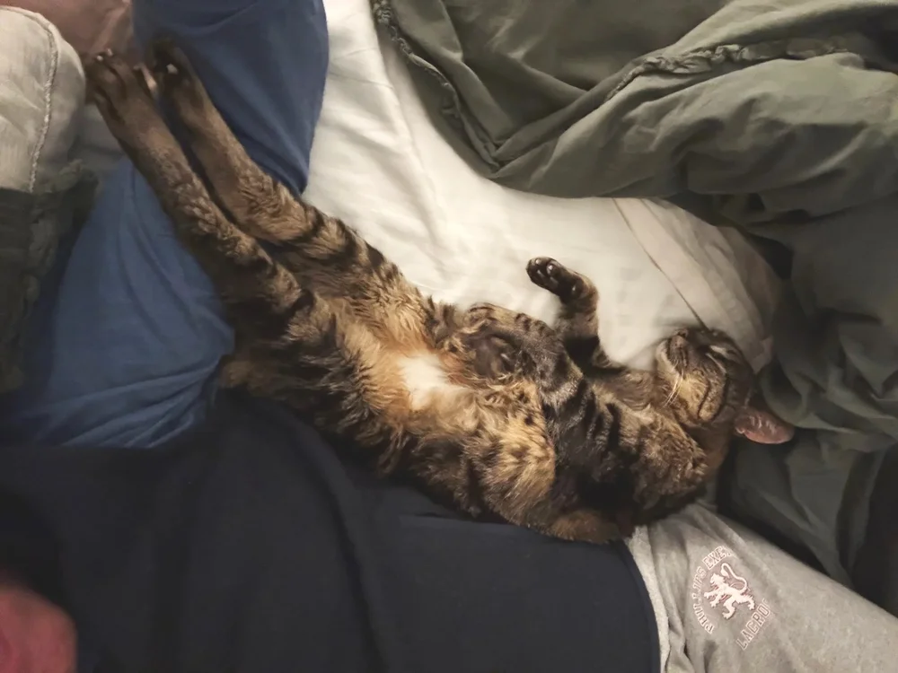 Olaf adorava guloseimas, quebra-cabeças, brinquedos e, acima de tudo, carinho. Às vezes ele ficava um pouco em conflito e sibilava quando eu passava pelo pequeno banheiro onde ficavam sua caixa de areia e tigelas de comida (seu local seguro). Mas quase imediatamente ele relaxou novamente. Nos curtos dias que passei com ele, assistindo a um programa no meu telefone enquanto ele se aninhava no meu colo, encontrando seus olhos verdes brilhantes e olhar firme, e escovando seu pelo que caía constantemente, me apaixonei fortemente por esse garotinho.