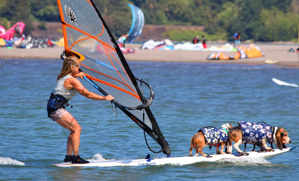 Meus três filhos de cães, Elvis, Cara e Doodle, Windsurf comigo no desfiladeiro do rio Columbia. Agora, é apenas doodle e eu. Aqui está a tripulação …