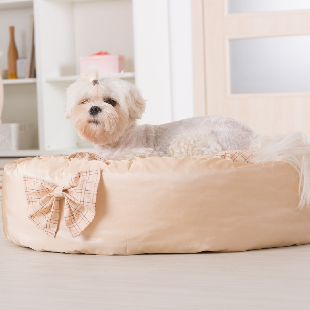 Cachorro branco pequeno deitado em uma cama de cachorro redonda bege com arco xadrez