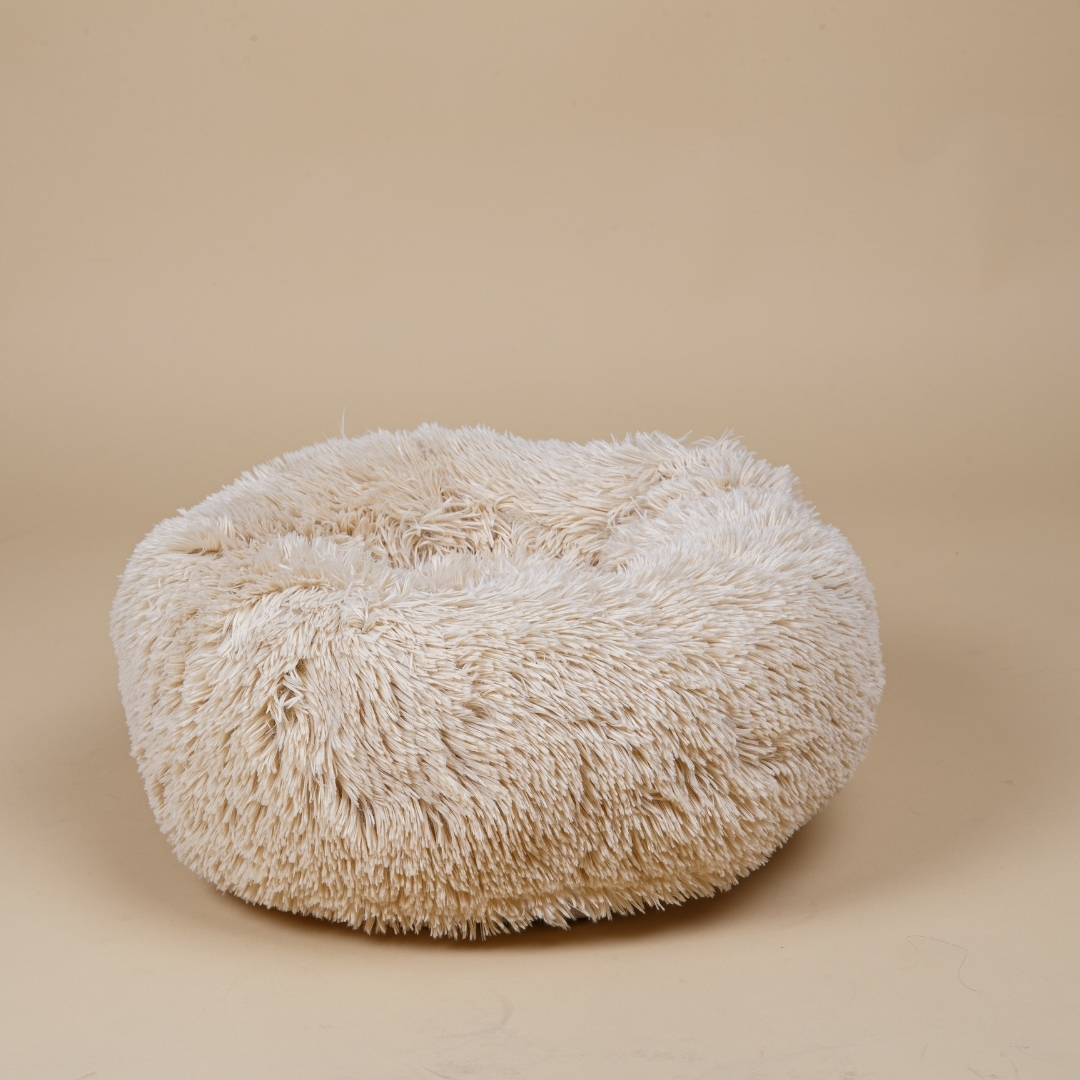 Cama de cachorro em forma de rosquinha bege de pelúcia em um fundo simples