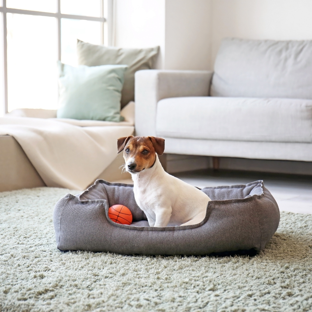 Cachorro pequeno sentado em uma cama de cachorro de camurça cinza com uma bola de brinquedo